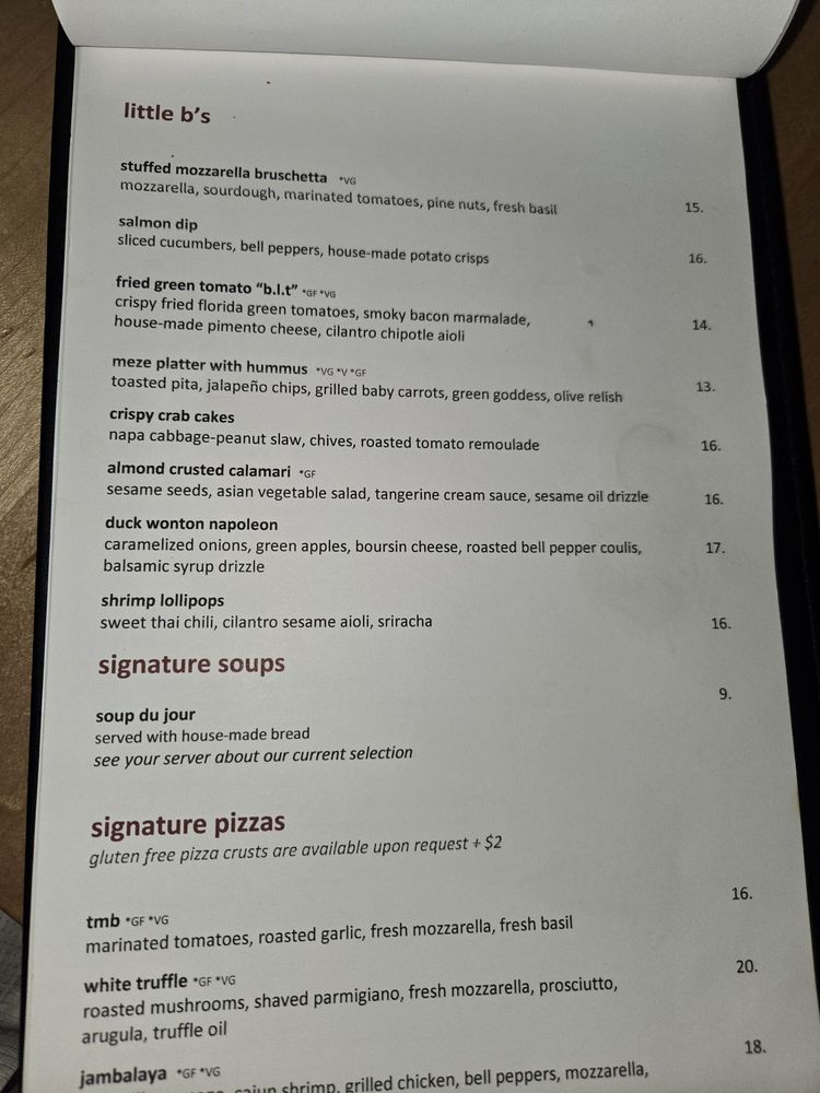 BB's is a trendy and classy New American dessert spot located in Jacksonville, FL. This restaurant offers a variety of options that cater to different dietary preferences, including vegan choices and gluten-friendly dishes. The menu features delicious starters like Almond Crusted Calamari and Duck Wonton Napoleon, as well as mouth-watering sandwiches such as the Ancho Spiced Rotisserie Turkey and Bistro Steak Sandwich. Additionally, their signature pizzas, like the Jambalaya Pizza and White Truffle Pizza, are must-try items. With a full bar, happy hour specials, and a casual yet elegant atmosphere, BB's is the perfect spot for a night out with friends or a special dinner. The restaurant also provides amenities like outdoor seating, free Wi-Fi, and drive-thru service, making it a convenient and enjoyable dining experience for all customers.